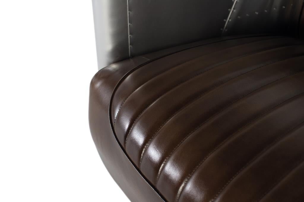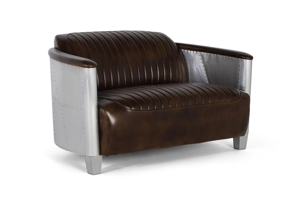 Ispirato al design industriale e all'estetica aeronautica, questo splendido divano a due posti in stile Aviator coniuga l'eleganza vintage con materiali audaci. Rivestito in pelle marrone invecchiata, offre una superficie morbida, resistente e confortevole, con cuciture verticali che ricordano i classici sedili di automobili e aerei di metà XX secolo. I lati curvi e lo schienale sono rivestiti con pannelli in alluminio lucidati a mano e rivettati che imitano lo stile della fusoliera di un aereo. Questo dettaglio metallico non solo conferisce un impatto visivo distintivo, ma esalta anche lo stile industriale-retrò dell'insieme.