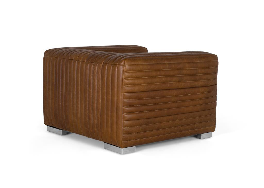 Questa poltrona si distingue per il suo design moderno e robusto, rivestito in pelle di alta qualità che offre morbidezza al tatto e grande resistenza. La sua finitura presenta un elegante motivo trapuntato con cuciture verticali. La struttura avvolgente e cubica offre comfort e fermezza. Le gambe in acciaio inox offrono stabilità, resistenza e un sofisticato contrasto con il calore della pelle.