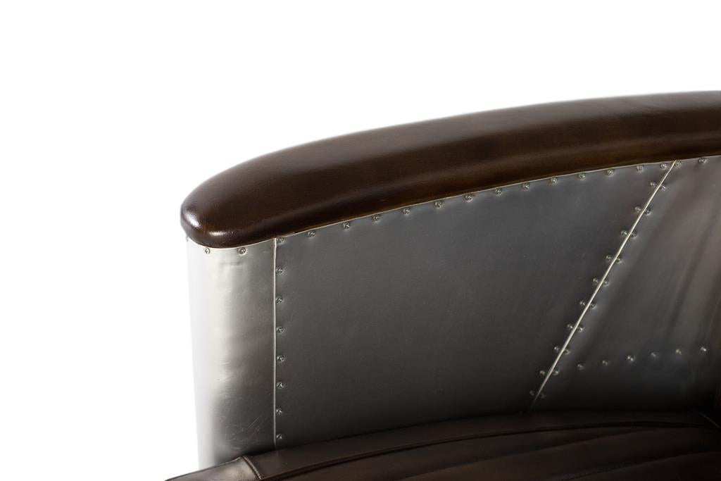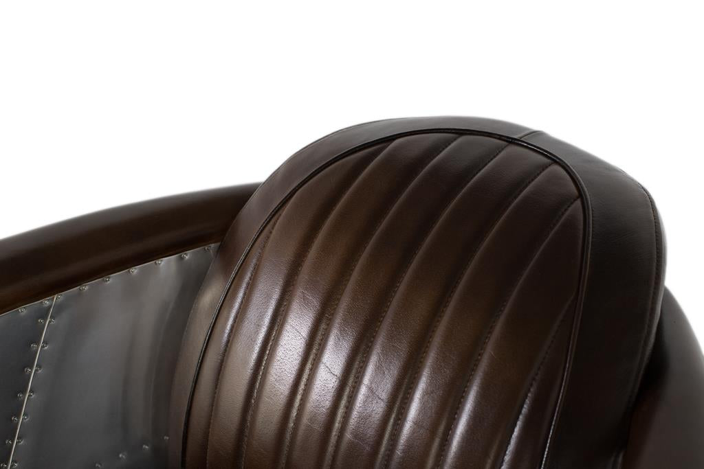 Ispirata al design industriale e all'estetica aeronautica, questa splendida poltrona monoposto in stile Aviator coniuga l'eleganza vintage con materiali audaci. Rivestito in pelle marrone invecchiata, offre una superficie morbida, resistente e confortevole, con cuciture verticali che ricordano i classici sedili di automobili e aerei di metà XX secolo. I lati curvi e lo schienale sono rivestiti con pannelli in alluminio lucidati a mano e rivettati che imitano lo stile della fusoliera di un aereo. Questo dettaglio metallico non solo conferisce un impatto visivo distintivo, ma esalta anche lo stile industriale-retrò dell'insieme.