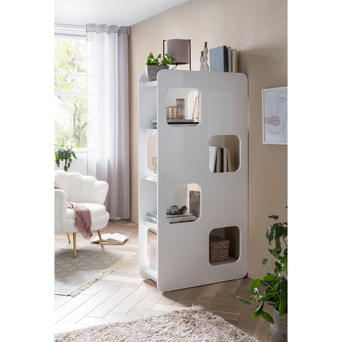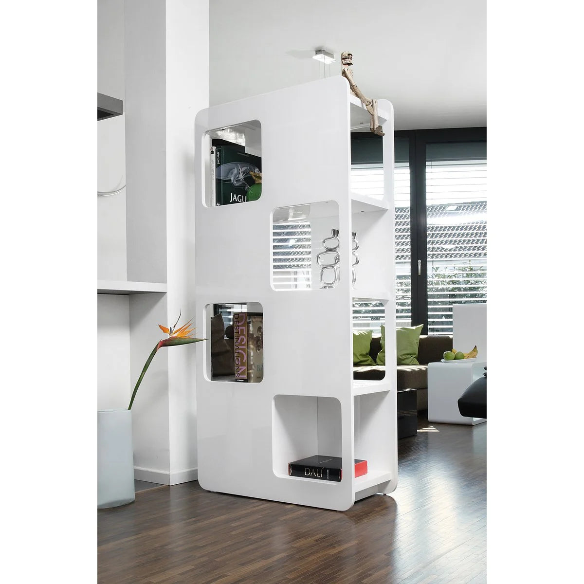 La soluzione salvaspazio per molto spazio di archiviazione. Il divisorio è realizzato in MDF e verniciato con uno strato bianco lucido. Lo scaffale ha 4 ripiani che offrono ampio spazio di archiviazione. Che si tratti di libri, cartelle o decorazioni. Sugli scaffali è possibile posizionare anche piccoli cestini portaoggetti in modo che le cose risposte non siano immediatamente visibili a tutti. Lo scaffale può essere ovunque nella stanza o appoggiato al muro. Grazie al suo design alla moda, questo divisorio si adatta a quasi tutti gli interni e trova il suo posto nel soggiorno o nella camera dei bambini, nel corridoio, in ufficio o nella zona notte. Lo scaffale alto non solo ha un aspetto molto elegante, ma serve anche al suo scopo. 4 ripiani, 8 scomparti aperti, liberamente posizionabili nella stanza, dimensioni dell'apertura: 30x30 cm, dimensioni scomparto: L30 x P32,4 x H33,6 cm