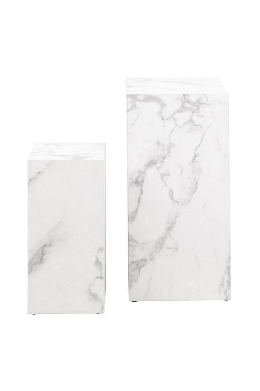 Questo elegante set di 2 tavolini rende il vostro soggiorno molto più elegante. La semplice forma cubica con ampia superficie mette in risalto il fantastico aspetto del marmo bianco. Il tavolino può essere utilizzato in molti modi, non solo accanto al divano, ma anche come comodino o come elemento di attrazione indipendente. Le diverse altezze possono essere posizionate una accanto all'altra con stile oppure utilizzate singolarmente in diversi punti del soggiorno, a seconda delle esigenze. Il set diventa anche un elegante eye-catcher nella vostra casa come sgabello per fiori o accessorio. Peso più grande: ca. L35 x P35 x H70 cm, dimensioni tavolino: ca. L25 x P25 x A50 cm, rivestito con pellicola di melammina effetto marmo, utilizzabile anche come sgabello per fiori