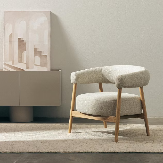 Poltrona imbottita MUE, tessuto beige chiaro / legno di quercia, forma arrotondata