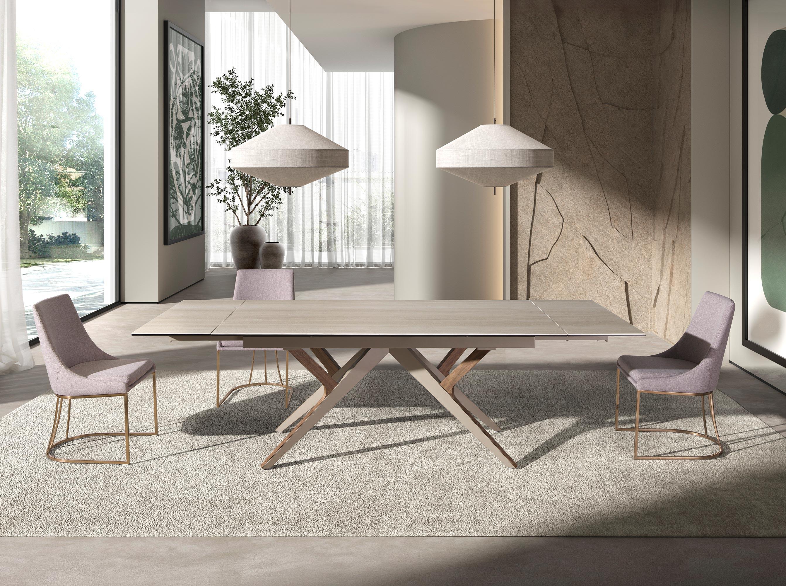 Tavolo da pranzo rettangolare allungabile dal design moderno con piano in marmo porcellanato color sabbia in finitura opaca. Le gambe in acciaio inox verniciate con effetto metallizzato color sabbia e l'impiallacciatura in noce naturale di 0,5 mm di spessore, oltre alla sua adattabilità, lo rendono un mobile perfettamente funzionale e versatile per l'uso quotidiano.