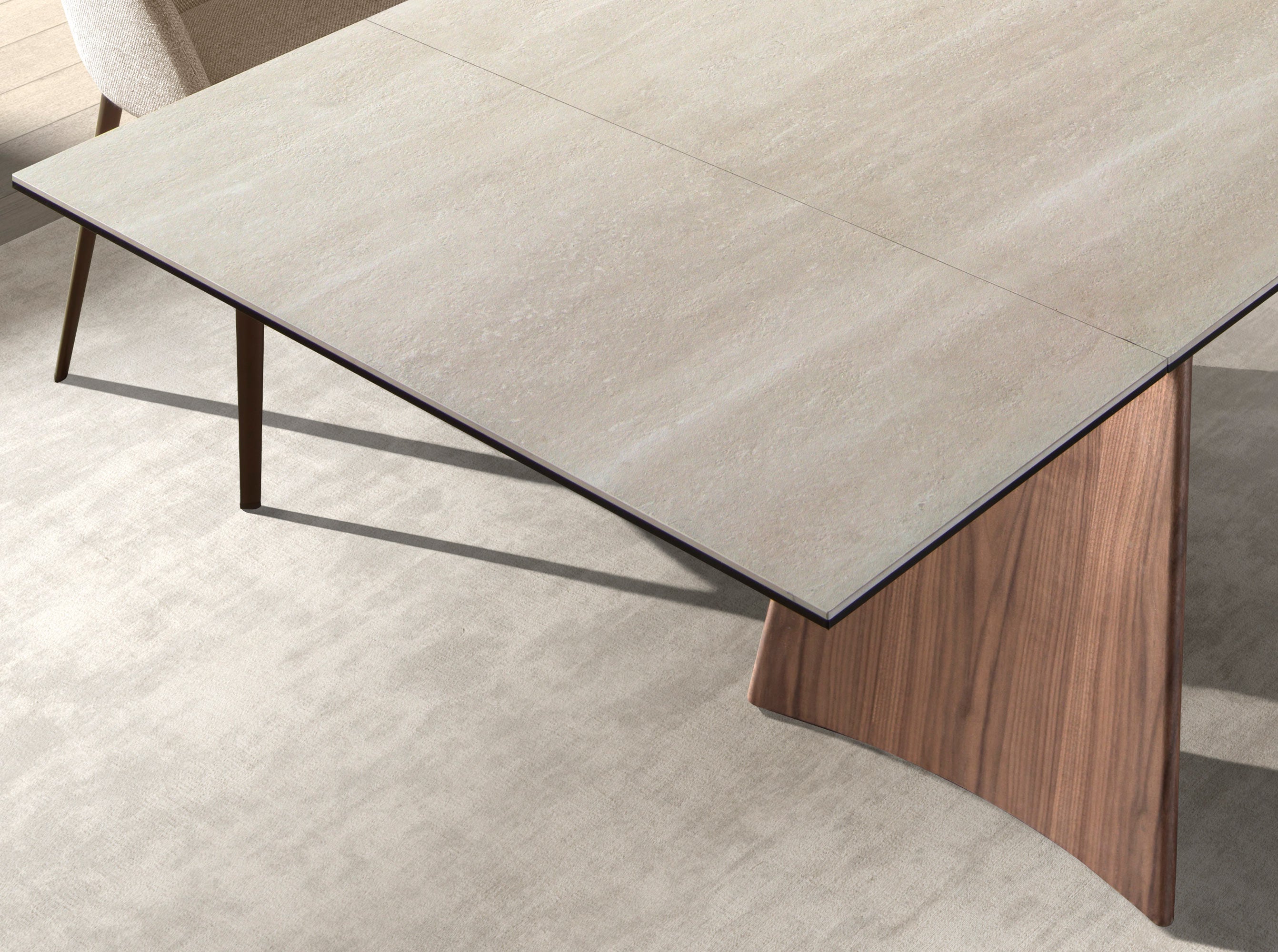 Tavolo da pranzo rettangolare allungabile dal design moderno con piano in marmo porcellanato color sabbia in finitura opaca. Le sue gambe in acciaio inox laccate in finto legno di noce e la sua adattabilità lo rendono un mobile pienamente funzionale e versatile per l'uso quotidiano.