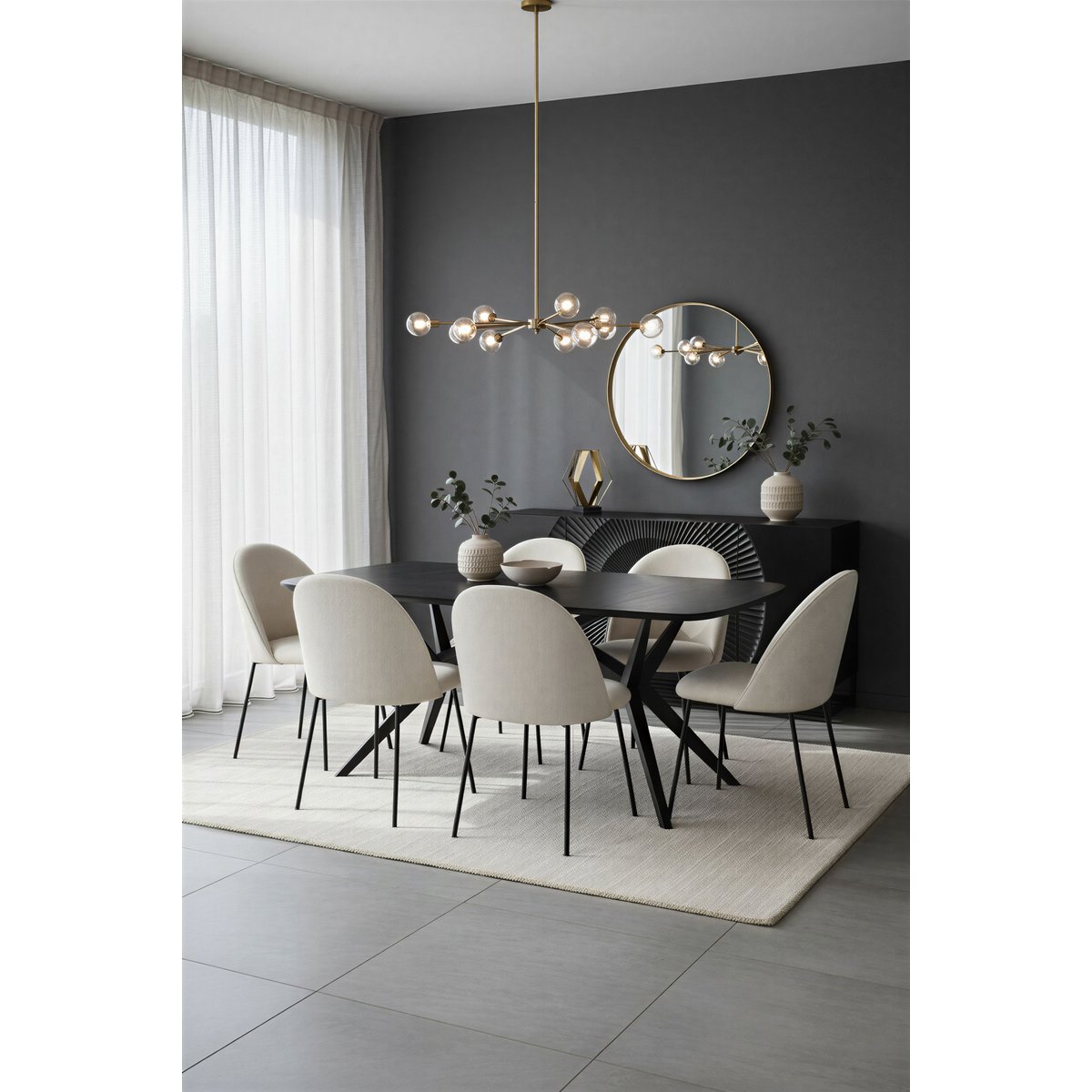 Questo tavolo da pranzo combina un design sorprendente con un'eleganza naturale. Il piano del tavolo in legno massello di mango è presentato in un elegante nero con venature a vista, che conferisce ad ogni esemplare un tocco unico. Con uno spessore della piastra di 30 mm convince per la sua stabilità e l'aspetto di alta qualità. Gli angoli arrotondati garantiscono linee morbide e sottolineano il design moderno ed equilibrato. Il telaio a forma di Y in acciaio con finitura anticata conferisce al tavolo un carattere industriale espressivo e allo stesso tempo offre un'elevata stabilità. Con le sue dimensioni di 240 x 100 cm, il tavolo offre spazio sufficiente per pasti condivisi e incontri sociali - un elegante centrotavola che combina perfettamente naturalezza, artigianalità e fascino da loft urbano. Per saperne di più