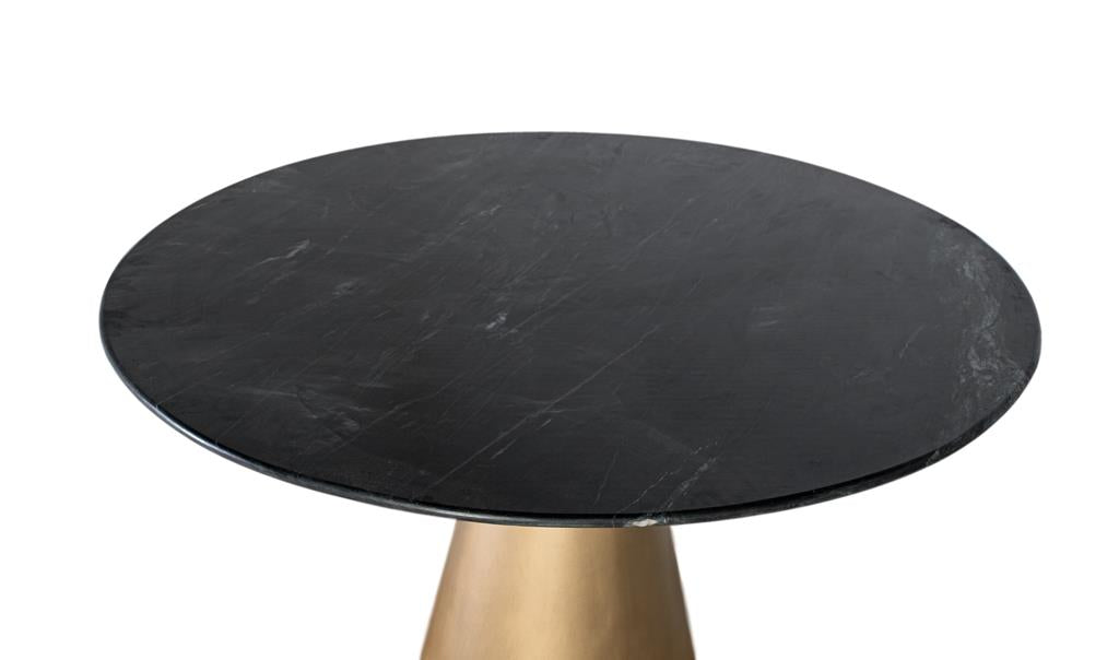 Questo tavolo da pranzo è un design contemporaneo che unisce eleganza e sobrietà. Il piano completamente rotondo è realizzato in marmo nero lucido. Le venature naturali del marmo aggiungono texture visiva e unicità a ogni pezzo. La base del tavolo è a forma di cono rovesciato, realizzata in metallo con finitura oro satinato. Questo elemento non solo garantisce una struttura solida e stabile, ma crea anche un piacevole contrasto visivo con la tonalità scura del marmo, aggiungendo calore e un tocco di lusso al tavolo.