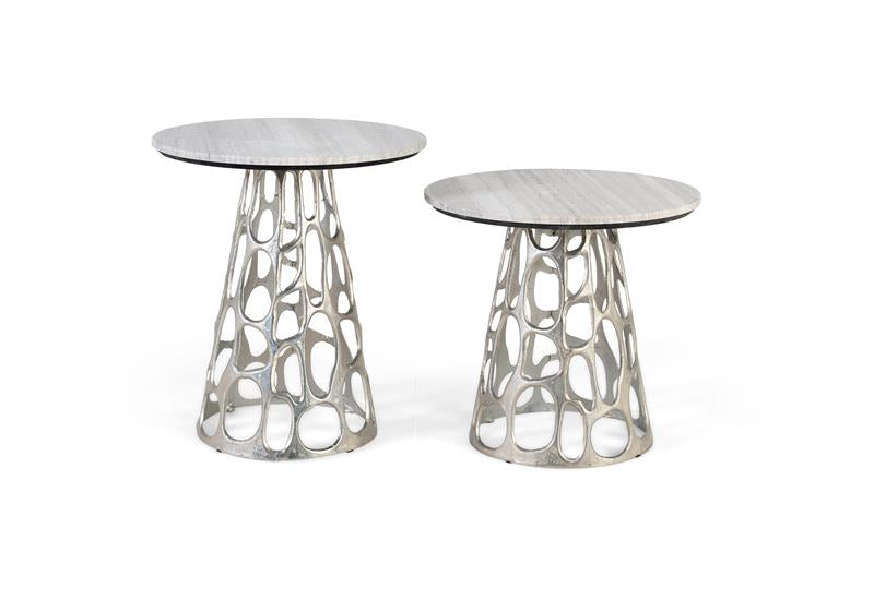 Questo set di due tavolini da caffè si caratterizza per il design elegante e i materiali di alta qualità. Ogni tavolo ha un piano circolare in marmo dai toni neutri, che aggiunge un tocco sofisticato e naturale all'insieme. La base dei tavoli è realizzata in alluminio con finitura nichel, che gli conferisce un aspetto moderno e una morbida lucentezza, bilanciando la freschezza del marmo con il calore metallico del nichel.