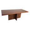 De vorm van de tafel is rechthoekig, met een kruisvormig onderstel.
