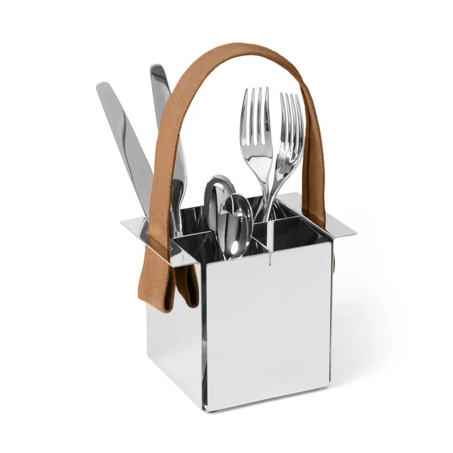 La cena perfetta: portaposate dal design elegante per ospiti attenti allo stile. Tavola lucida: acciaio inossidabile di alta qualità, resistente e senza corrosione. Manico laterale: perfetto anche per barbecue o una colazione soleggiata in terrazza. Coltelli, forchette, forbici e tanta luce: estate, sole, feste barbecue, lunghe panche di legno, tovaglie a quadri e una scelta di posti a sedere. Un allegro trambusto e tanto divertimento. "Qualcuno può passarmi una forchetta?" Già fatto! Il pratico portaposate A Tavola è pronto da prendere e con un semplice gesto è esattamente dove servire. Raffinato, in acciaio, antiruggine. Qui tutti possono servirsi senza dover chiedere. Anello in acciaio inossidabile molto lucido con manico in lino. Perfetto come regalo di nozze, per lui e per lei, da giardino, per barbecue, uso interno ed esterno, d'estate.