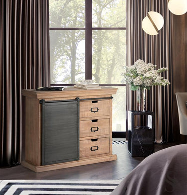 CASSETTIERA DI STILE INDUSTRIALE IN LEGNO DI MANGO MASSICCIO CON SPORTELLO SCORREVOLE IN METALO