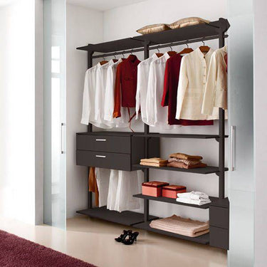 5 ripiani bassi e 4 cassetti in melaminico wengè permettono di organizzare il proprio guardaroba nel migliore dei modi. I ripiani più alti sono utili per riporre cappelliere o scatole. Le traverse orizzontali offrono un'ampio spazio per appendere gli abiti.