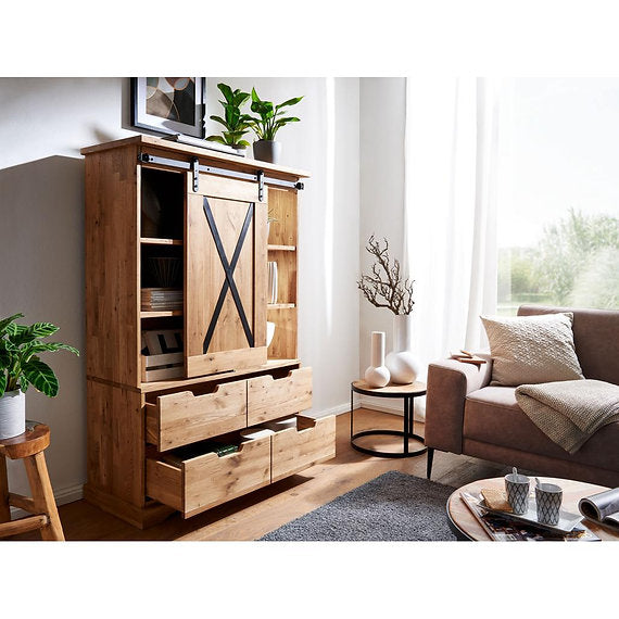 La vetrina Nyks, realizzata in massello di rovere ed elementi in metallo, conferisce carisma e stile moderno a qualsiasi ambiente. Il suo design unico la rende la scelta ideale per arredamenti moderni, catturando l'attenzione con la sua bellezza naturale e l'esclusiva struttura in legno. L'insolito sistema di apertura delle ante consente una regolazione flessibile, consentendo di scegliere il lato con vano aperto e quello chiuso, aumentando la funzionalità del mobile. La vetrina Nyks offre spazio sia per gli oggetti che vogliamo nascondere alla vista degli ospiti, sia per quelli che vogliamo esporre, decorando lo spazio. Il set di mobili Nyks è realizzato in pregiato legno massello di rovere e metallo, che ne garantiscono la durevolezza e la solidità. Ogni pezzo di questa collezione attira l'attenzione con dettagli caratteristici, come le "x" in metallo sui frontali delle ante e le guide che fungono da cerniere, consentendo un'apertura efficace delle ante facendole scorrere. I mobili Nyks sono caratterizzati da una forma interessante, grazie alla base fresata e alle linee semplici e regolari. La collezione comprende cassettiere solide e resistenti, mobili porta TV, vetrine, un tavolino e una mensola, perfetti per composizioni che puntano su un'atmosfera calda e accogliente, ma al tempo stesso su accenti espressivi e originali. La combinazione di metallo e legno è perfetta, dove il legno dona calore e il metallo nero aggiunge carattere e austerità ai mobili. Le caratteristiche naturali del rovere, come la disposizione unica delle venature, il colore e i nodi, rappresentano un ulteriore vantaggio. La valorizzazione di questi dettagli rende ogni mobile unico e irripetibile. Dimensioni: • Larghezza: 102 cm • Altezza: 152 cm • Profondità: 42 cm • Peso: 78 kg Informazioni aggiuntive: • Materiale: rovere oliato • Frontali: realizzati in rovere massello tagliato a misura • Corpo: rovere massello su microgiunzioni • Dettagli: insegne "x" in metallo sui frontali e sulle guide • Retro del mobile: in compensato • Montaggio: mobili consegnati completamente montati • Prezzo: non include l'illuminazione La vetrina Nyks non è solo un elemento d'arredo, ma anche un elemento di stile che aggiungerà carattere ed eleganza a qualsiasi interno.