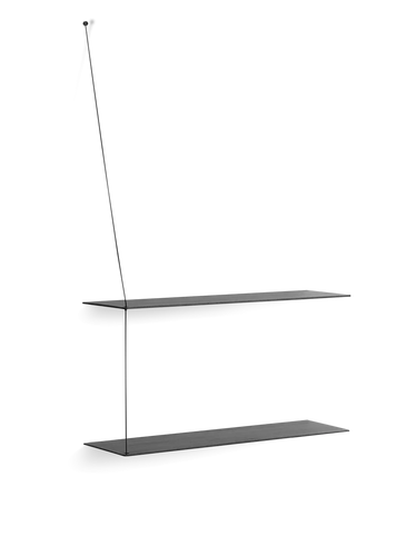 Materiales: Estantes de roble macizo pintado y alambre metálico pintado de negro.