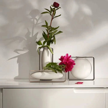 Nada perturba el jarrón FLOAT: cuelga libremente de la estructura metálica y al mismo tiempo eleva las flores a nuevas esferas. El cuerpo cerámico se puede quitar para verter o rellenar y brilla incluso con algunas flores. Si su cuerpo bien formado le roba el protagonismo al ramo floral o viceversa, ¿quién sabe? Es un punto culminante de cualquier manera.