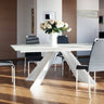 Le gambe in acciaio laccato sono abbinate a un elegante piano in vetro temperato acidato oppure ad un piano in ceramica accoppiata vetro (spessore 3 o 6 mm) o marmo in diverse finiture.