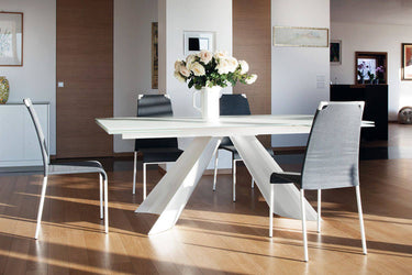 Tuile-A misura 198 x 98 cm ed è facilmente allungabile a 294 x 98 cm, tramite due allunghe laterali di 48 cm l'una. Le allunghe sono realizzate in vetro, come il piano.