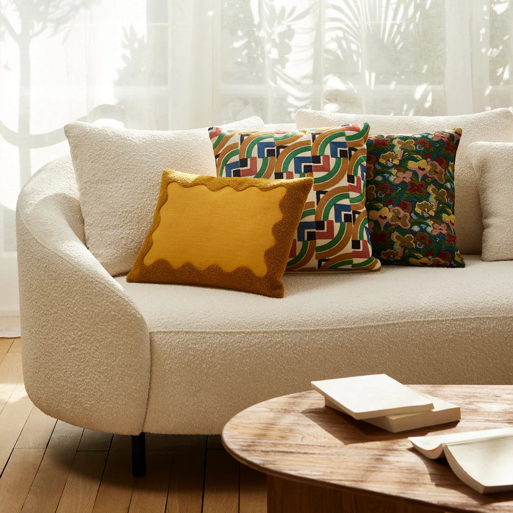 Diventerà il fulcro dei tuoi interni, donandogli un aspetto accogliente e retrò. Il suo rivestimento in spugna ecrù gli conferisce quell'effetto cocoon che amiamo. Le sue voluttuose linee curve e i numerosi cuscini imbottiti offrono tutto il comfort necessario per un momento di relax.