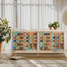 CREDENZA CON 4 PORTE IN LEGNO DI MANGO CON PARTICOLARI IN MAIOLICA E BRONZO.